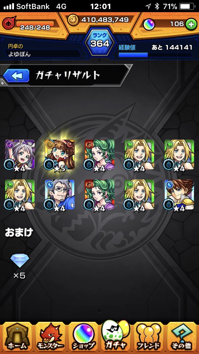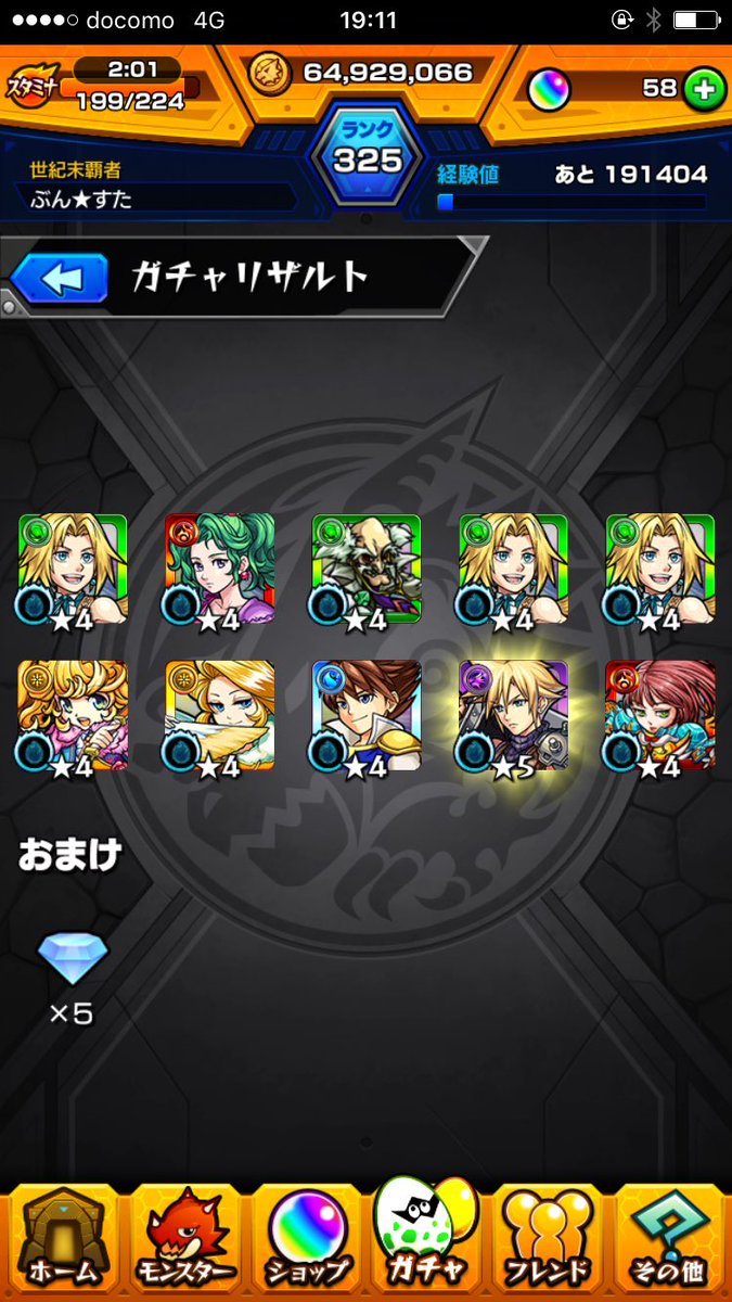FFコラボガチャ結構回しましたw獣神化決まったジュリエット3体目も出たしwwとりあえず前回のキャラが出過ぎでスコール3体クラウド2体ライトニング3体orzま、クラウドは1体しか居なかったから嬉しいけど他は…wティーダユウナが1体しか出なかったので明日のピックアップ10連して出たら良いな