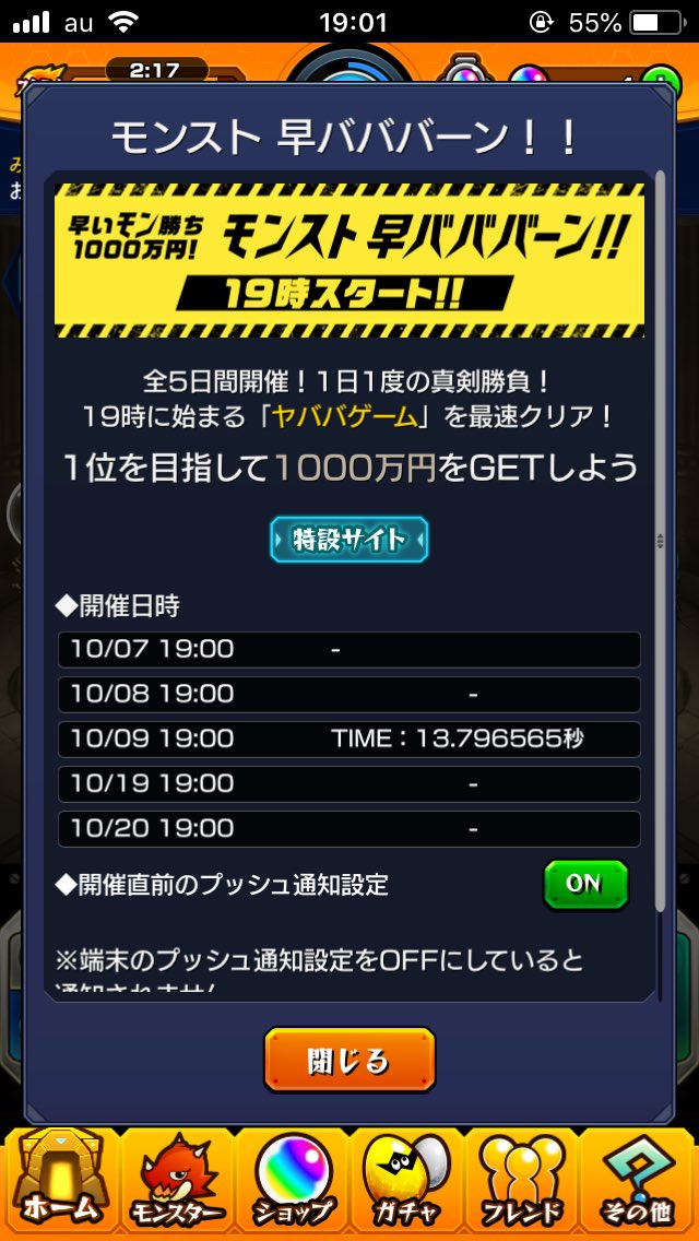 サーバー負荷でヤババゲーム参加できなかった人もいるみたいだけど通知の通りに10分前に開いとけば良かったのでは。私は10分前に開いたけど普通だった。