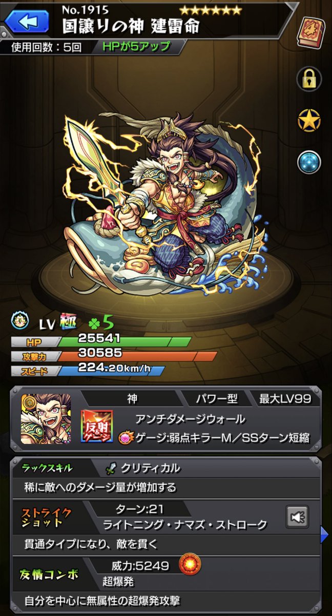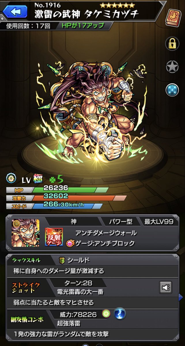 最近持ってるキャラどんどん獣神化していくなぁ、タケミカヅチも禁忌で使えるやつだから嬉しいね