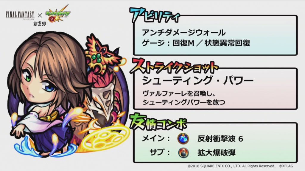 モンストFFコラボ第2弾、性能としてはユウナが欲しい。砲撃型であの友情コンボはかなり強い。しかも回復M&状態以上回復持ち。SSも一番凝ってそうな気がする。単ギミック対応とはいえ、今回のぶっ壊れ枠と思う。見た目としたらもちろんティーダが欲しい。後はミッション報酬のオニオンナイト。