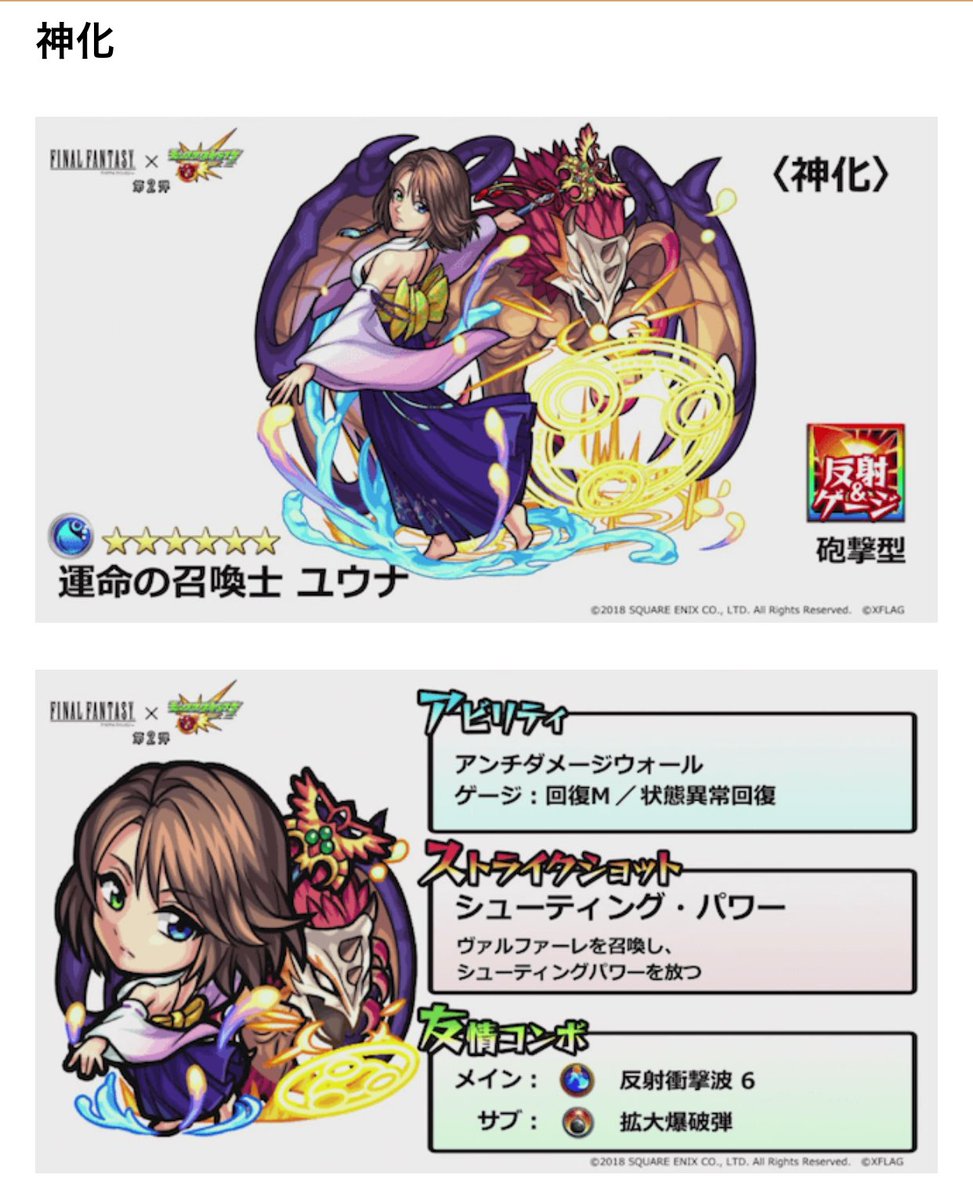 モンストFFコラボ第2弾、性能としてはユウナが欲しい。砲撃型であの友情コンボはかなり強い。しかも回復M&状態以上回復持ち。SSも一番凝ってそうな気がする。単ギミック対応とはいえ、今回のぶっ壊れ枠と思う。見た目としたらもちろんティーダが欲しい。後はミッション報酬のオニオンナイト。