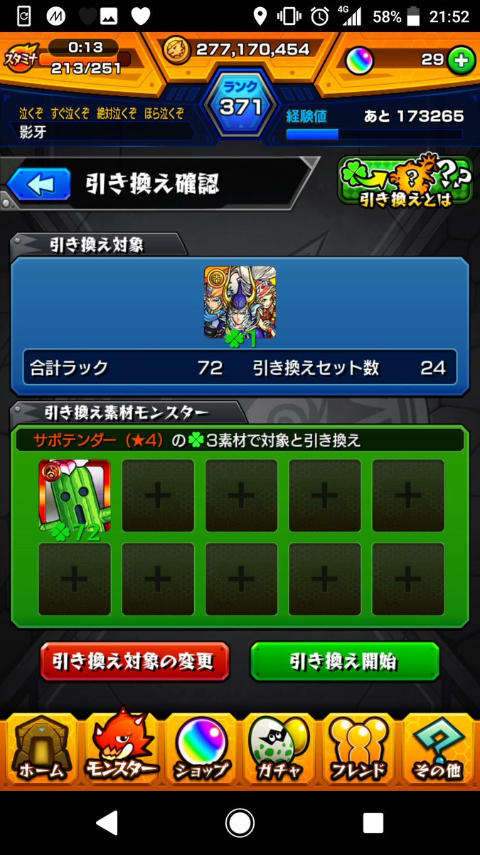 サポテンダーをラック60にするとボーナスが付いて72になるよね!72を4体で光の戦士96体と交換できるからログボの分と合わせると運極になるわけだ( ¨̮ )称号と交換する人は自動合成にしてるともったいないから要注意ね( ¨̮ ) ↓サブ2のモン玉
