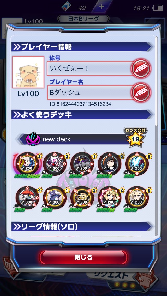 ついにファイトリーグのレベル100になったぜ!去年の6月に配信されてからずっとやってきたけど、未だに最終ランキング100位内に入れた事がないから、もっと頑張りたいな。1位になった事はあるんだけど…やっぱ最終日の前日にたくさんしないとダメかなぁ。