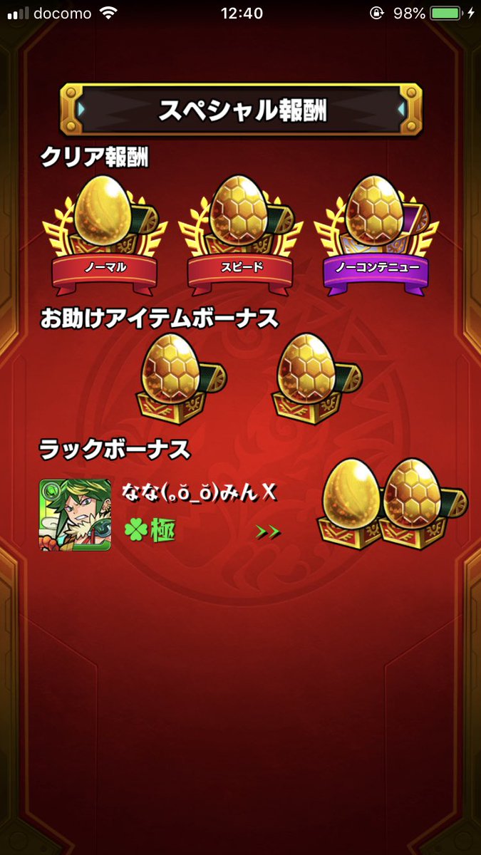 ・「ノーマル報酬」「スピード報酬」「ラックボーナス」で、「蓬莱(★5)」をゲットできる可能性アリ。すなわち、クリアしても、100%ボスがゲットできるわけではないぞ!ゲットできるかどうかは、あなたの運次第!また、「ノーマル報酬」「スピード報酬」「ノーコンテニュー報酬」「ラックボーナス」で、まれに「獣神玉」が排出されることも!?