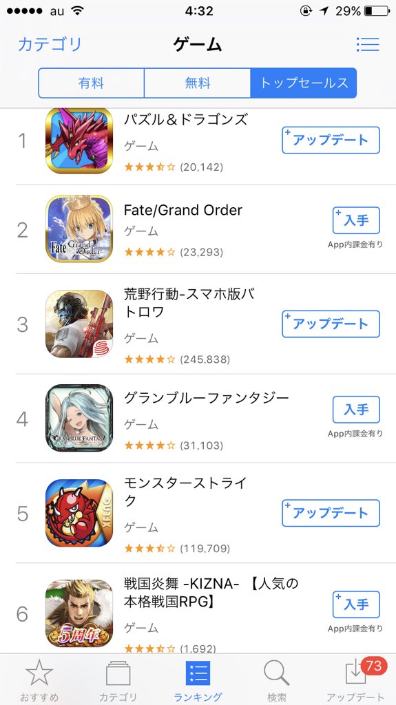 売上FGO1位モンスト2位でグラブル6位だけどモンストそんなに人気なの