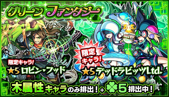排出キャラは「デッドラビッツLtd.」「ザドキエル」「ロビン・フッド」等を含む木属性のみ!さらに、ラック5で排出!