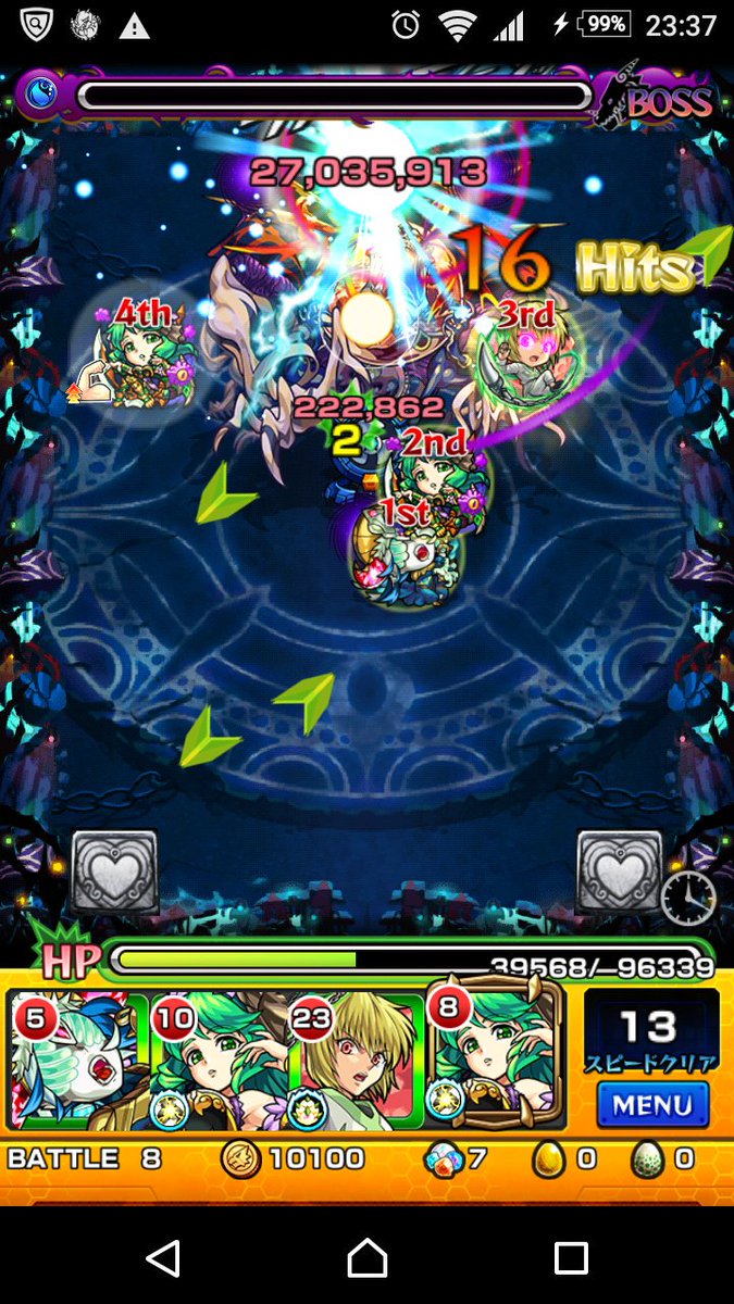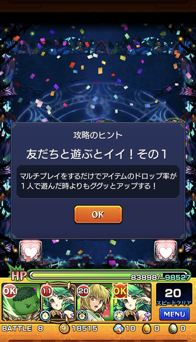 ウィンドキャラいた方がいいかも、重なるとダメージでかいし、誰が混乱かわからない。ハルク強い、ベルフェ最強、クラピカ、スピードアップいいし、4体倒しのとこはHP低いので貫通で一筆できる。