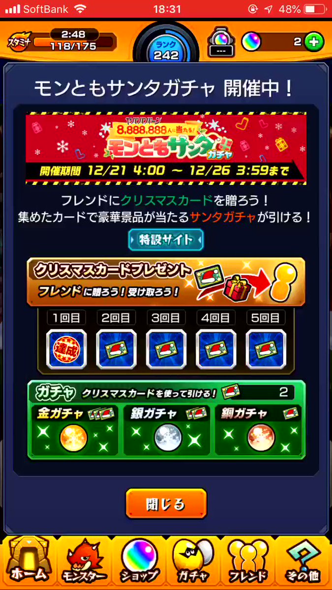 モンともサンタガチャ!金ガチャできたから、やってみたけど3等。。。。