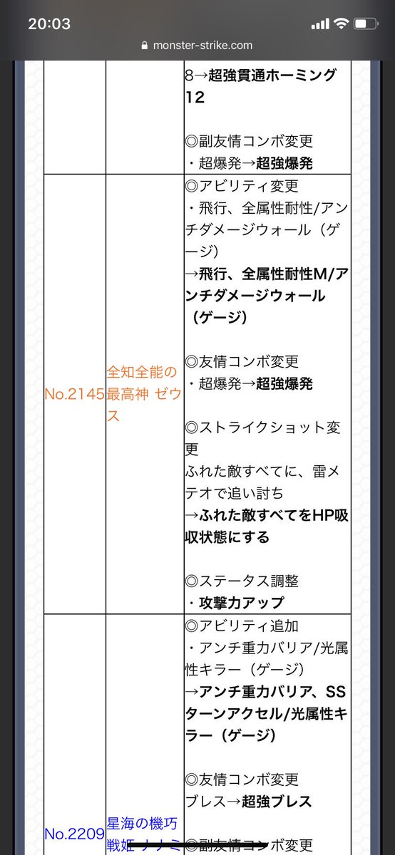 | No.2145 | 全知全能の最高神 ゼウス | ◎アビリティ変更 ・飛行、全属性耐性/アンチダメージウォール(ゲージ) →飛行、全属性耐性M/アンチダメージウォール(ゲージ) ◎友情コンボ変更 ・超爆発→超強爆発 ◎ストライクショット変更 ふれた敵すべてに、雷メテオで追い討ち →ふれた敵すべてをHP吸収状態にする ◎ステータス調整 ・攻撃力アップ |