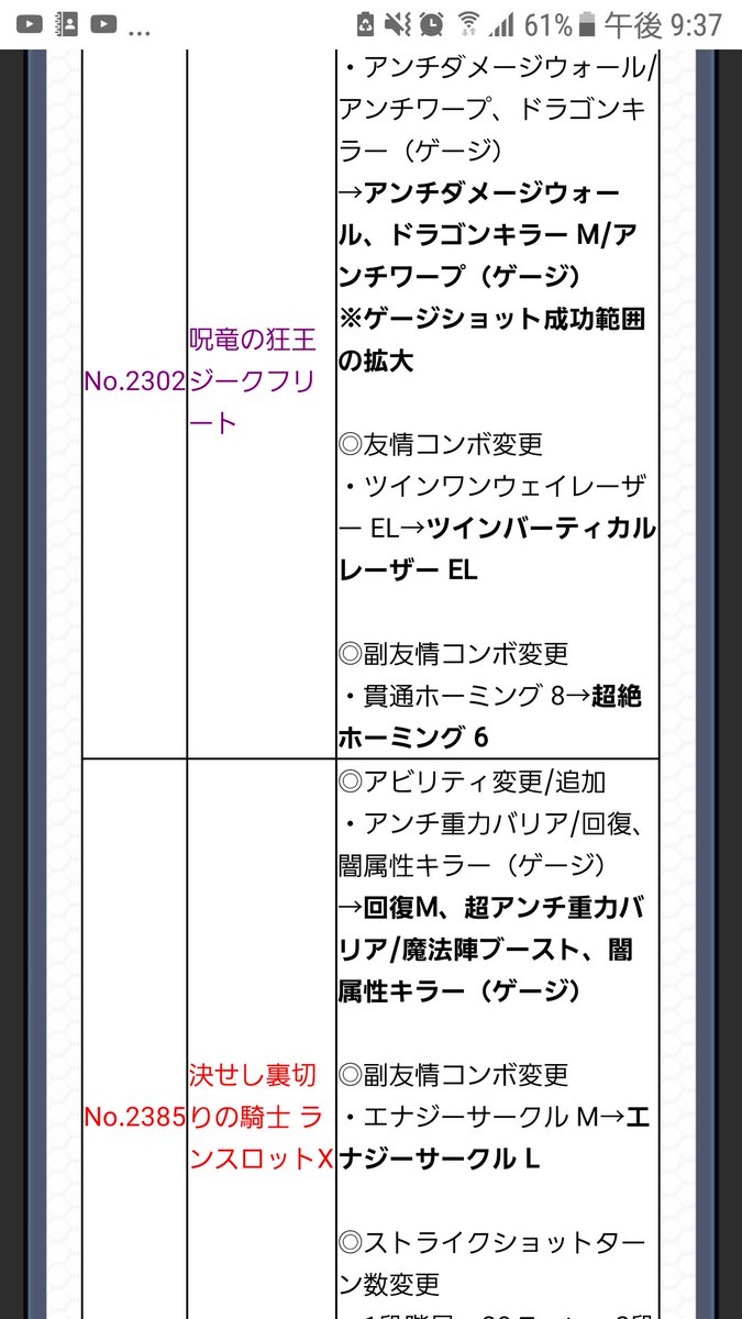 | No.2385 | 決せし裏切りの騎士 ランスロットX | ◎アビリティ変更/追加 ・アンチ重力バリア/回復、闇属性キラー(ゲージ) →回復M、超アンチ重力バリア/魔法陣ブースト、闇属性キラー(ゲージ) ◎副友情コンボ変更 ・エナジーサークル M→エナジーサークル L ◎ストライクショットターン数変更 ・1段階目:20ターン、2段階目:24ターン →1段階目:16ターン、2段階目:20ターン |