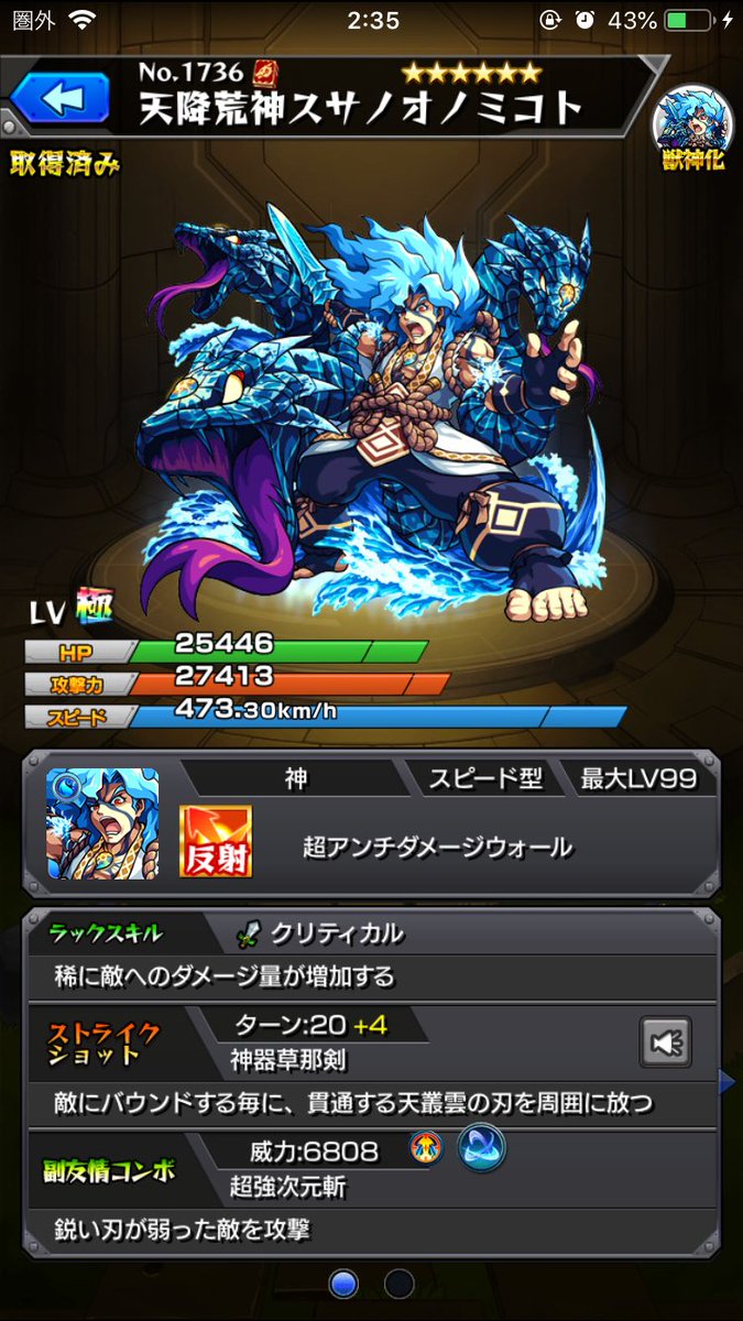【モンスト】※速報※「上がり幅やっばww」「いけるやんww」上方修正『獣神化スサノオ』ステータス判明!解禁直後に大盛り上がりうぉぉぉ━━━━(゚∀゚)━━━━!!
