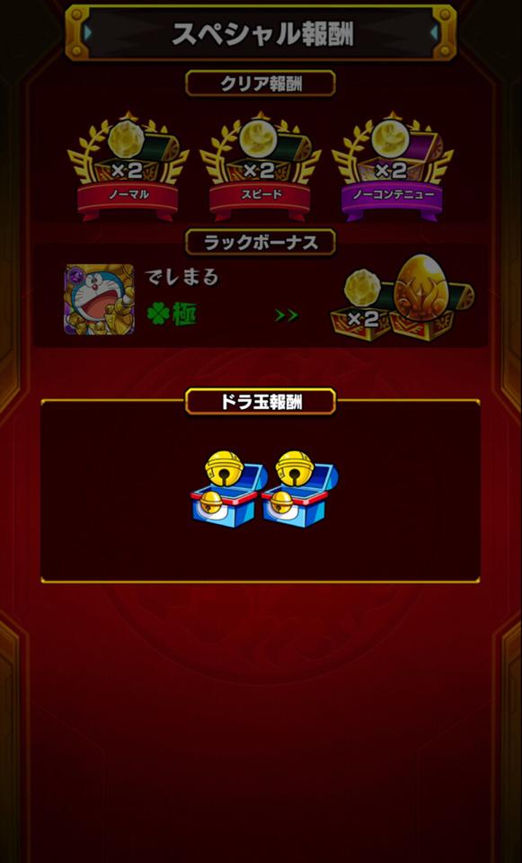 のび太、スネ夫、ジャイアンを運極にするのにドラ玉250〜300個必要らしい。4ドロのディアボロを70回やれば3体運極ができる。冴羽獠が30回程度、海坊主が70回程度で運極になっている。コラボの常設1ドロクエと同等の周回数で運極3体手に入る。オマケでドラえもんも付いてくる