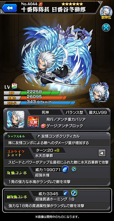 日番谷も弱くはないが強くもないなコレ。3つアンチアビもって汎用性とかいう中途半端になるやつ。ステは高いけど、飛行かブロックどっちかにして超AGBだったらよかったんだが #モンスト
