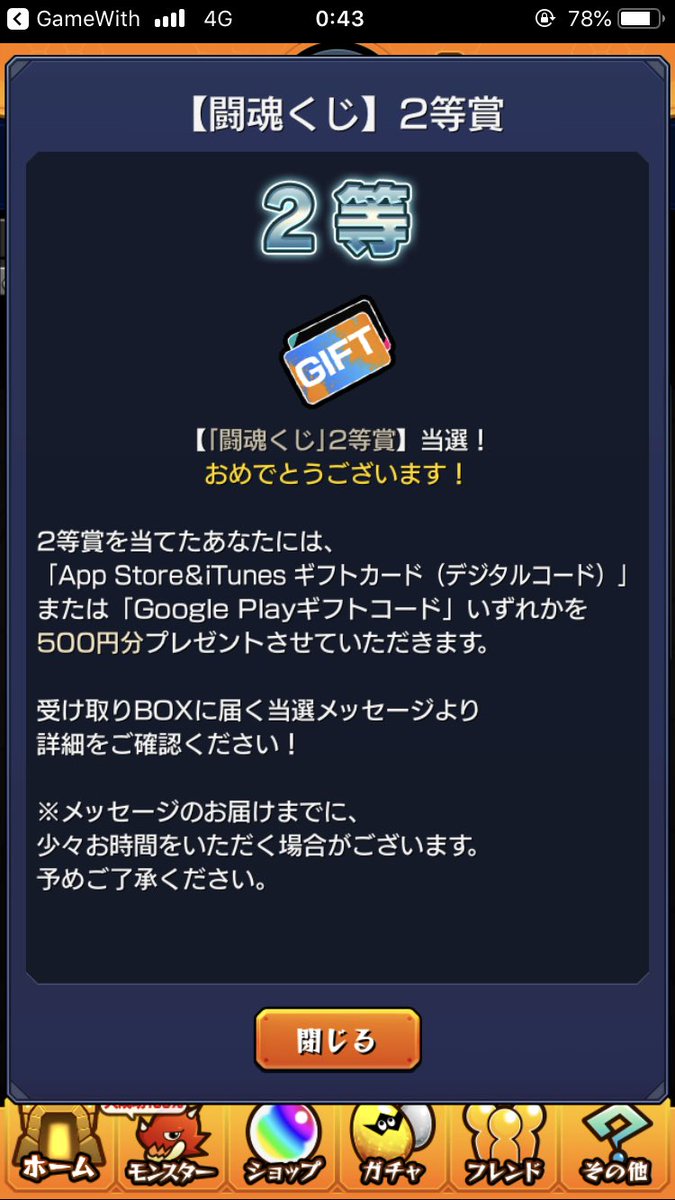 ※報酬(闘魂くじ)の受け取り期限は7月4日(木)AM3:59までです。