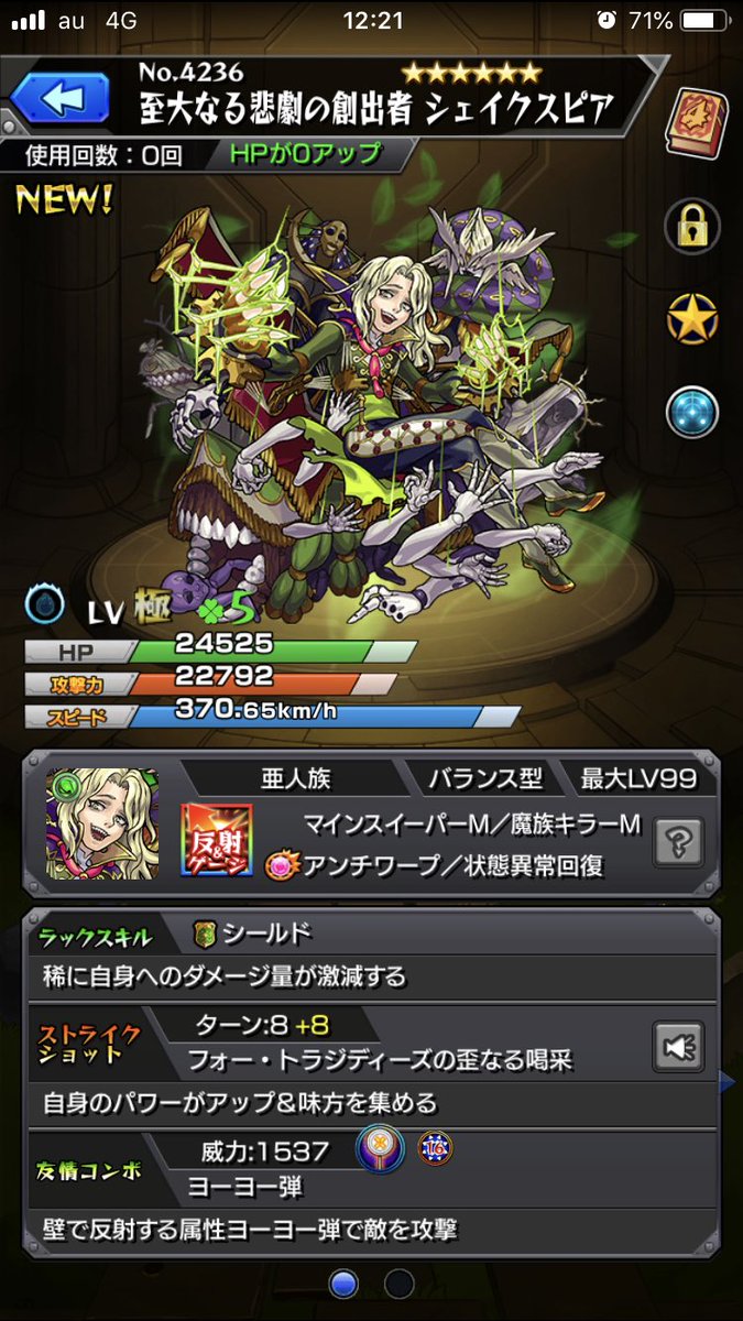 混乱状態や雪だるま状態を正常化させる状態異常回復を所持でギミック適正キャラなのに試せない状況です!獣神化『シェイクスピア』ステータス
