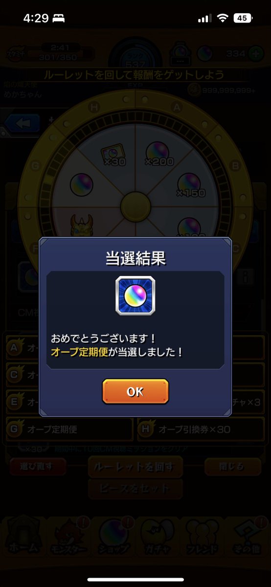 てか、オーブ200個で止まったと思ったら再抽選始まって一気にオーブ定期便のマスで止まったわ