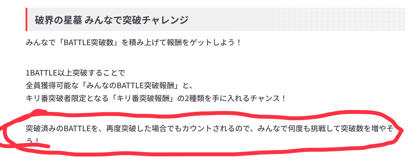 突破済みのバトルを再度突破してもカウントされますって書いてるし、俺はクリア済みのとこ周回してもキリ番貰えたぞ